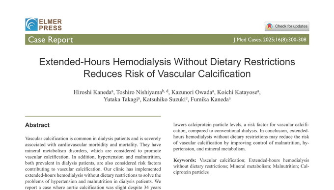 金田浩所長先生の論文『「長時間透析と自由食」治療法は血管石灰化(動脈硬化)の進展のリスクを軽減します。』がJ Med Cases. 2025;16(8)に掲載されました。